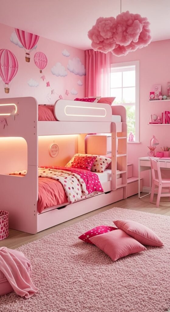 A pastel pink bunk bed adaptation brings dreamy charm to shared or youth bedrooms. Elegant curves, gentle hues, and soft materials create a space that feels whimsical while remaining coordinated and functional.