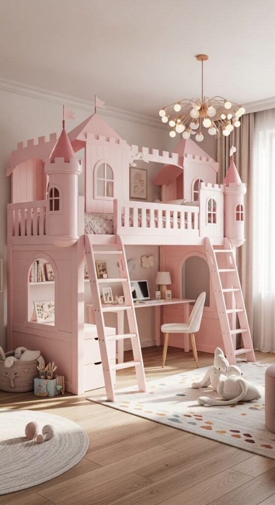 A whimsical pink loft bed styled like a miniature castle with subtle detailing brings charm and imagination to children’s rooms. Built-in ladder and space beneath for play or study make it functional and enchanting.