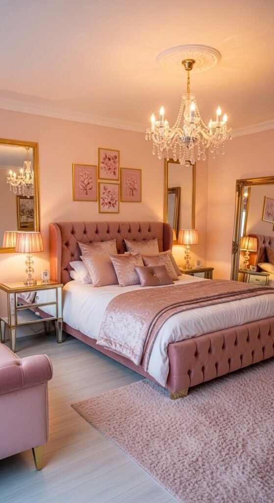 A glamorous pink bed paired with delicate gold accents and mirrored furniture infuses a room with Hollywood-inspired luxury. Velvet textiles and artful lighting enhance the sense of opulence without feeling heavy.
